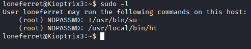 Let’s run sudo -l and see if loneferret can run ht with escalated privileges.